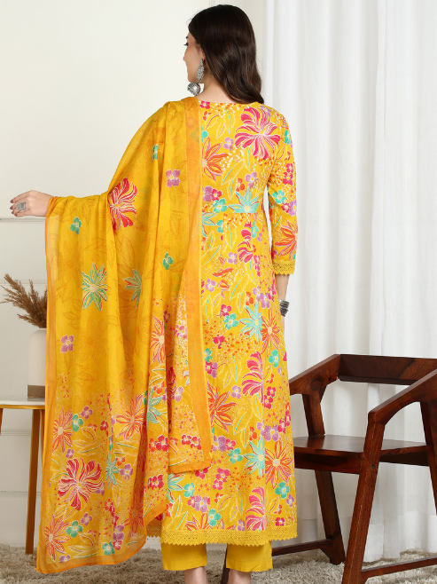 Fashion Plus Store Women’s Cotton Printed Anarkali Kurta with Dupatta and Pant Embroidered Neckline & 3/4 Sleeves (Yellow)