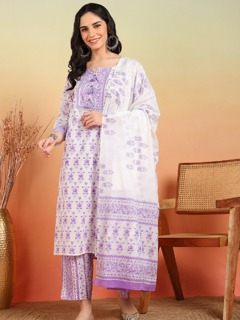 Fashion Plus Store Women's Plus Size Cotton Calf Length Notch Neck 3/4 Sleeves Floral Print Straight Kurta with Pant and Dupatta